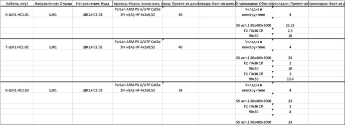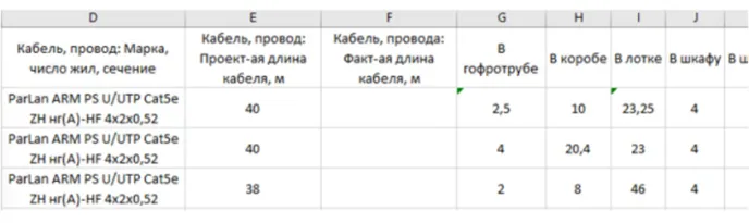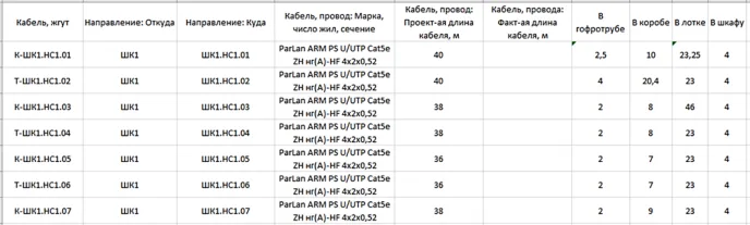 nanoCAD BIM ОПС и nanoCAD BIM СКС формируют таблицу прокладки кабелей в виде, представленном на рис. 1.