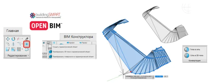 nanoCAD BIM Строительство поддерживает импорт всех отраслевых форматов, а также позволяет выполнить преобразование IFC-объектов сторонних BIM-решений в параметрические объекты nanoCAD BIM Строительство. Для этого импортированный объект взрывается командой Разбивка. Сеть, полученная таким образом из IFC-объекта, затем преобразовывается в 3D-тело одноименной командой на вкладке 3D. На этом этапе мы можем применить к телу булевы операции. Если мы опять преобразуем тело в сеть, активируется режим редактирования сети за отдельные узлы. Таким образом, комбинируя свойства сетей и тел, мы можем добиться оптимального результата редактирования (рис. 13).