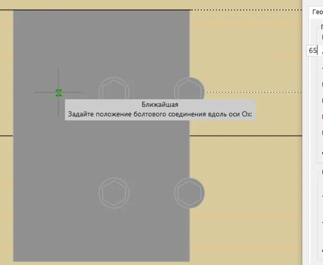 После выбора объектов для создания болтового соединения задается размещение соединения – указанием базовой точки (рис. 45), ориентации и поворота (рис. 46). Затем указывается положение вдоль осей Ox и Oy (рис. 47, 48).