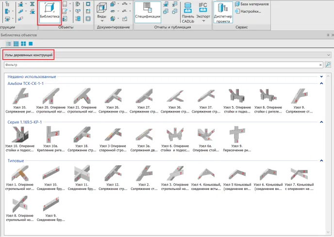 Следует выполнить подрезку стоек и раскосов. Для этого вы можете воспользоваться готовой базой узлов для деревянных конструкций, а также некоторыми вариантами узлов для конструкций металлических. Открыть базу можно в библиотеке (раздел «Объекты»), а выбрать нужную категорию – в списке или по результатам поиска с помощью Фильтра (рис. 21). В базе представлены типовые узлы деревянных конструкций, Альбом ТСК-СК-1-1 и Серия 1.169.5-КР-1. При необходимости узлы можно создавать самостоятельно и добавлять их в базу для последующего использования.
