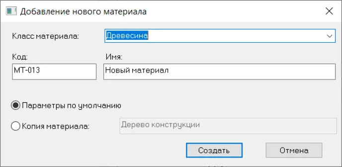 Выбор материала осуществляется в соответствующей библиотеке (рис. 7), где есть возможность воспользоваться готовым вариантом либо создать свой собственный. Новый материал можно формировать с нуля или на основе существующих. Все необходимая информация по тематике деревянных конструкций располагается в классе Древесина.