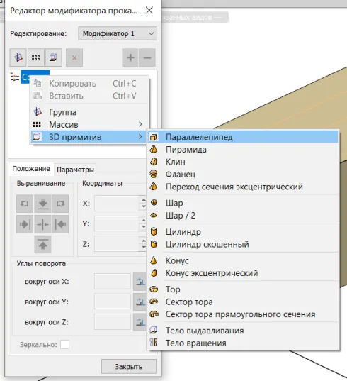 Выделяем полученную балку, выбираем Редактор модификатора проката. Появляется окно состава модификатора, с которым мы будем работать. Изначально оно пусто. Чтобы добавить элемент, щелкаем правой кнопкой мыши по Составу и выбираем 3D-примитив → Параллелепипед (рис. 33).