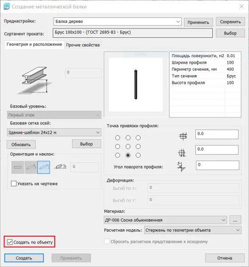 В окне создания балки можно настроить ее профиль по различным параметрам: