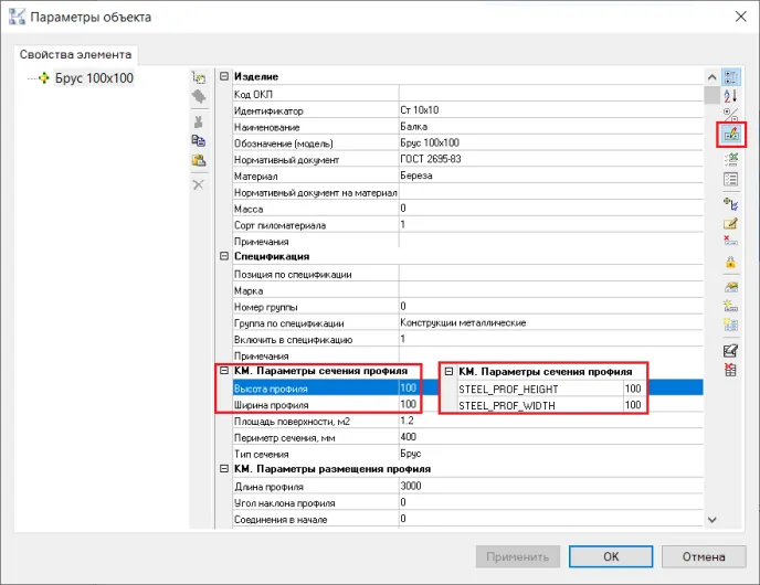 Теперь необходимо указать корректные параметры согласно рис. 31. Для этого привяжем геометрию и базовую точку параллелепипеда к размерам балки. Чтобы выбрать, к чему именно следует выполнить привязку, откроем параметры балки. На рис. 35 мы видим размеры бруса, которые указываются в параметрах сечения: Ширина профиля (STEEL_PROF_WIDTH) и Высота профиля (STEEL_PROF_HEIGHT). В нашем случае несущественно, какой из параметров мы выберем, поскольку они равны. Чтобы увидеть второе наименование параметра, следует повторно нажать на знак в свойствах элемента.