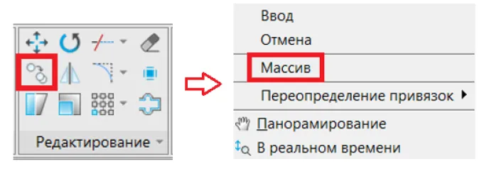 При помощи функции Массив (рис. 14), которая позволяет несколько раз скопировать элемент, уточняем количество брусьев и точки привязки (вписывание или шаг), создаем из брусьев стены (рис. 15). Вызвать функцию массива можно при помощи команды Копировать (CTRL+SHIFT+D): открыть контекстное меню нажатием правой кнопки мыши и выбрать строку Массив.