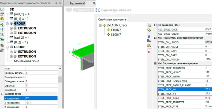 В структуре Редактора видим две группы GROUP, каждая из которых отвечает за геометрию одного из уголков. Обратив внимание на параметры размещения Базовой точки, увидим, что элементы смещены на расстояние от грани до центра тяжести. За данный параметр отвечают параметры [STEEL_PROF_X0] и [STEEL_PROF_Y0] в свойствах объекта (рис. 11).