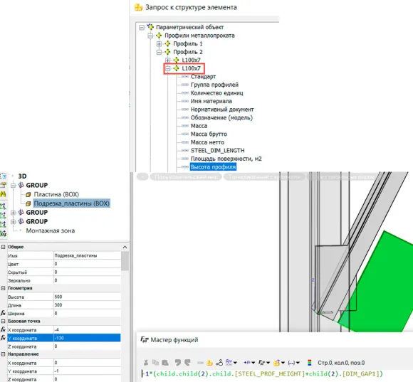 Выполним подрезку связи. В группе (GROUP) связи создадим параллелепипед и повернем его вокруг оси Z на 1800. Переименуем в Подрезку связи, зададим Геометрию и Базовую точку. Высоту (150) введем вручную - Длина будет равна следующей формуле через Запрос к текущему элементу: Ширина сечения профиля связи *2 + Зазор/Отступ в Профиле 2 (Связь) – (рис. 46).