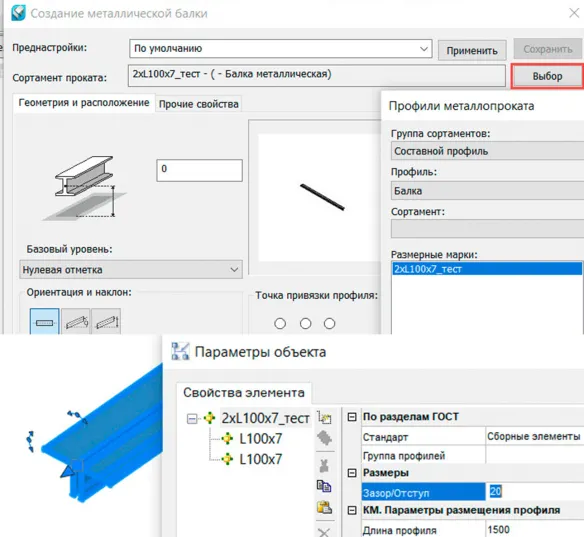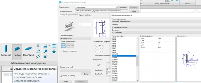 Для решения нашей задачи (установить регулируемое через параметр [DIM_GAP] (Зазор/Отступ) расстояние между уголками) создаем новый профиль. Команда Создание металлической балки - выбираем сечение балки - ОК (рис. 4).