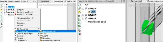 В структуре редактора создается BOX, который определяет параллелепипед, и он размещается в координатной системе связи. Данный примитив показан только для примера, поэтому удалим его (щелчок ПКМ на «BOX» - Удалить подобъект).