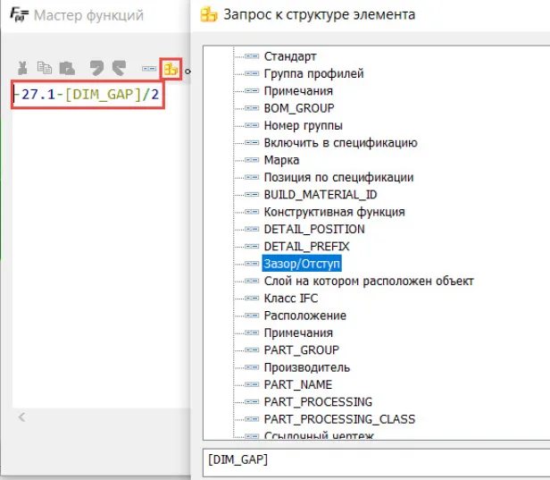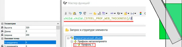 Вызываем Мастер функций - Запрос к текущему элементу - в группе Профиля 1 выбираем параметр [STEEL_PROF_WEB_THICKNESS] (Толщина стенки) и делим его на 2 (рис. 33).
