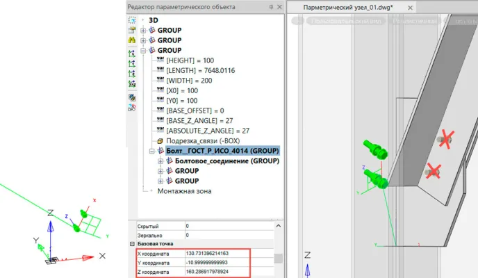 Если в Редакторе параметрического объекта сейчас выбрать объект «Болт», мы увидим, что болты разместились в 0-й координате модели. Для добавления их к узлу необходимо переместить в редакторе группу Болт в группу связи. Для корректного расположения в системе установим все координаты в Базовой точке размещения болтов по 0, а также зададим нужное направление размещения (рис. 53, 54).