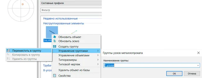 Если разместить элемент в разделе Составные профили Базы элементов, его можно будет использовать непосредственно из редактора Балки/Колонны. Находим профиль в Базе элементов - Щелкаем на нем правой кнопкой мыши (ПКМ) - выбираем Управление группами, а затем Переместить в группу - в поле Наименование группы указываем Т-уголки (рис. 15).