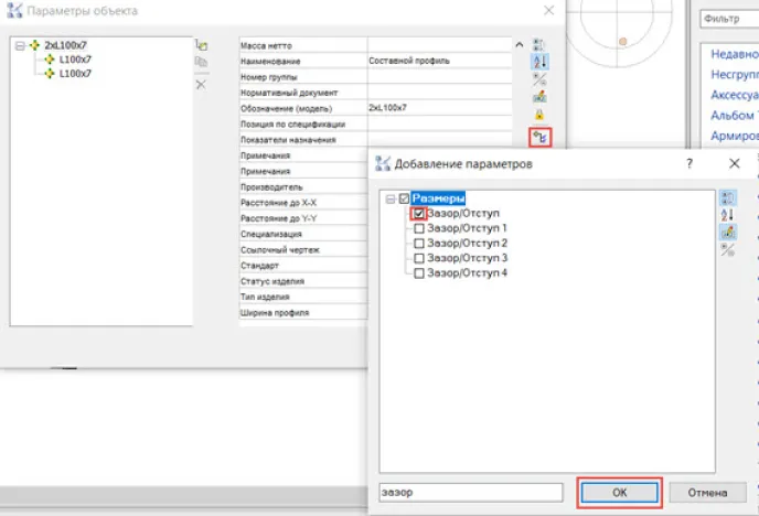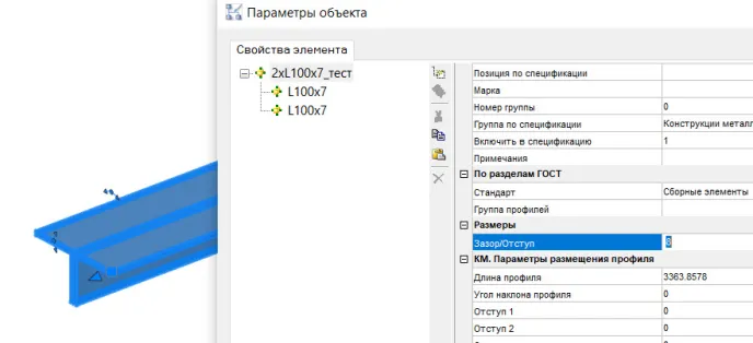 Теперь мы можем регулировать расстояние между уголками через свойства составного профиля, задавая значение в параметре Зазор/Отступ.