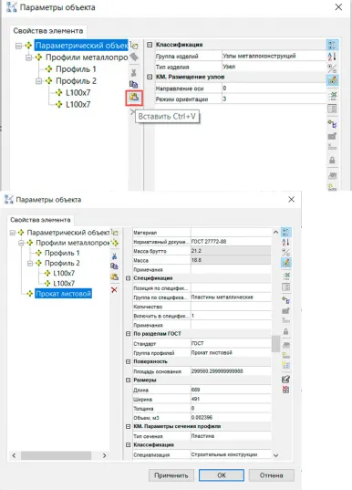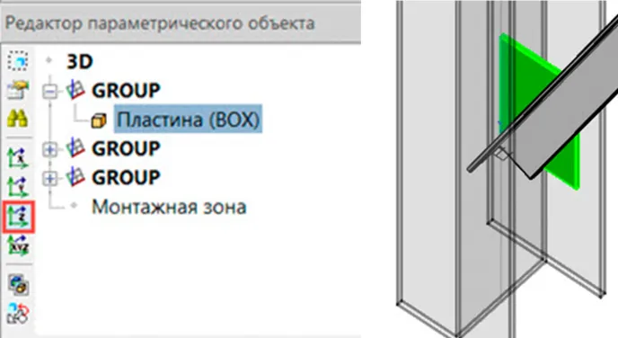 Закрываем окно свойств и заходим в Свойства узла, после чего устанавливаем курсор на Параметрический объект для обеспечения нужного уровня вложенности пластины и нажимаем кнопку Вставить (рис. 23).