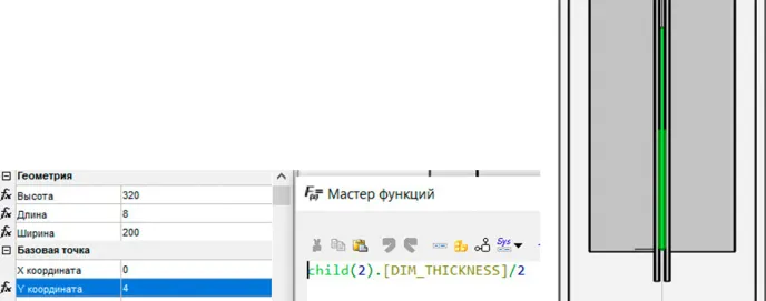 Далее Базовая точка - Х координата - Мастер функций - Запрос к текущему элементу - выполняем запрос к параметру Толщина пластины и делим его на 2. Также нам необходимо задать отрицательное значение координаты – для этого в формулу вводим «-1*». Получаем следующую формулу для вычисления параметра (рис. 39: -«1*child(2).[DIM_THICKNESS]/2)».
