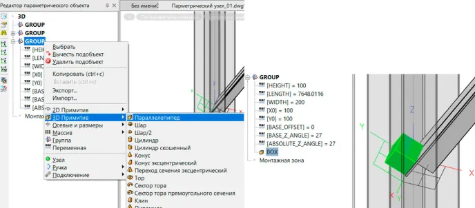 При создании любого примитива в группе автоматически определится его положение по координатной системе элемента. Создадим, например, параллелепипед в группе связи: щелчок ПКМ на группе связи - 3D Примитив - Параллелепипед (рис. 20).