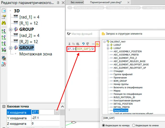 Задаем положение Базовой точки по координате X: к существующему значению добавляем параметр из свойств элемента [DIM_GAP] (Зазор/Отступ) и делим его на 2, так как уголок сдвоенный (рис. 12).