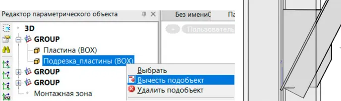 Теперь выбираем элемент Подрезка пластины - щелкаем на нем ПКМ - выбираем Вычесть подобъект - перед объектом появляется знак «-», означающий, что объект вычитается из другого объекта. Чтобы отменить вычитание, необходимо снова выбрать Вычесть подобъект (рис. 41).