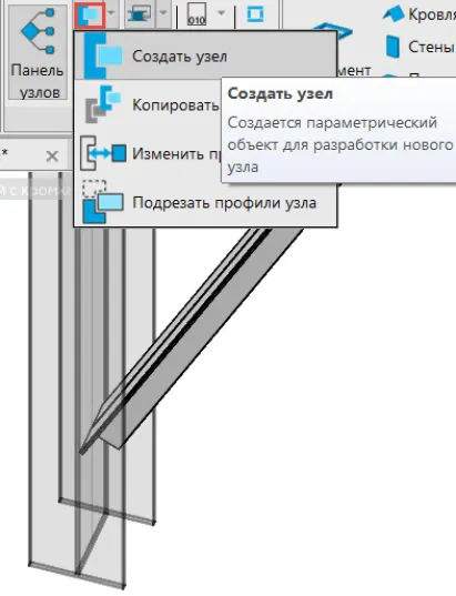 Выполняем построение колонны (двутавр) и связи (сдвоенный Т-образный уголок) на отметке +500 мм от базы колонны - выбираем команду Создать узел (рис. 17), где задаем металл 1 – Колонна и металл 2 – Связь - указываем Авто как Способ определения базовой точки узла. В месте пересечения осевых центров тяжести элементов создается маркер узла.