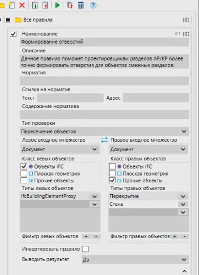 Разберем принцип работы инструмента Проверка модели на примере нескольких базовых вариантов проверки. Для начала посмотрим, как можно упростить формирование отверстий путем проверки между объектами IFC и элементами BIM Строительство. Создадим новое правило с настройками, показанными на рис. 13.