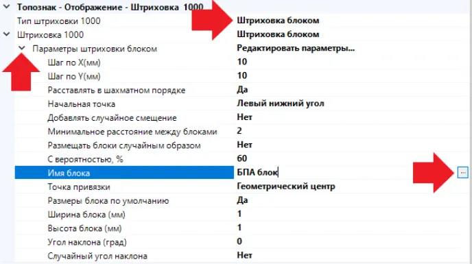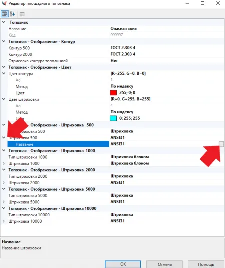 В открывшемся окне Редактора площадного топознака мы можем настроить его контур, цвет контура и цвет штриховки. А также определить, чем именно он будет представлен – штриховкой или группой блоков. Обращаю ваше внимание: чтобы изменить тип штриховки или блока, необходимо развернуть поле с названием, нажав на стрелочку вниз. Как и в Редакторе точечного топознака, мы можем выбрать штриховку из стандартного списка, нажав на многоточие (или просто ввести ее название) (рис. 24).