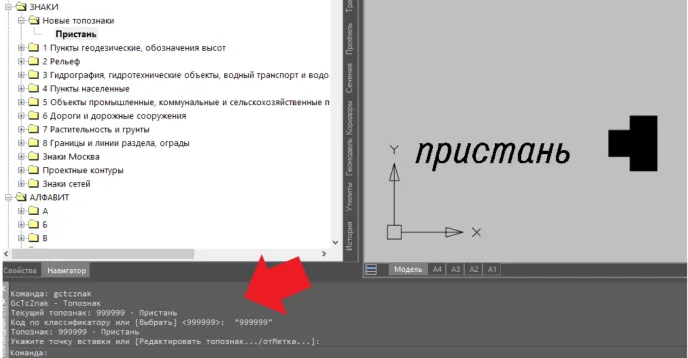 После установления всех этих настроек можно выйти из редактора, нажав на кнопку ОК. Теперь мы сможем в один щелчок мыши создавать наш УТЗ Пристань. Прошу обращать внимание на командную строку, так как если при нажатии команды отрисовка топознака не происходит, возможно, программа не смогла найти код по классификатору (например, на который ссылается команда, названа по-другому) (рис. 13).
