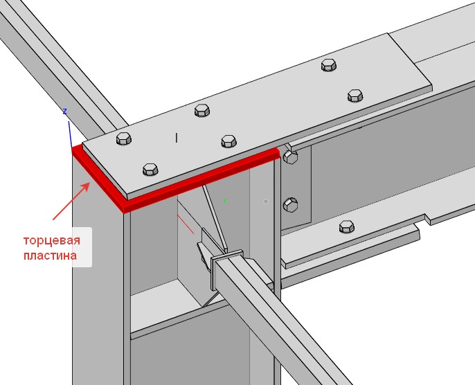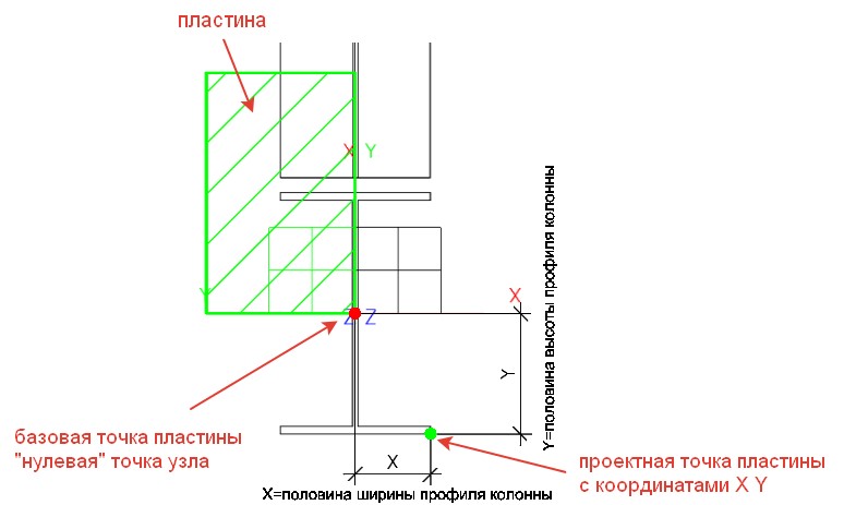 На виде узла сбоку в плоскости ХZ (рис. 28) геометрически определяем для пластины координату Z относительно «нулевой» точки узла. Координата Z зависит от высоты сечения балки (Hб), высоты (толщины) пластины (Нпл), высоты сечения колонны (Нк).