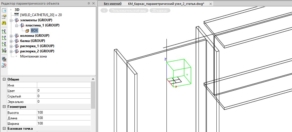 3D-примитив «ВОХ» создается в «нулевой» точке узла (это точка создается при формировании узла командой Создать узел) с базовой геометрией 100х100х100.