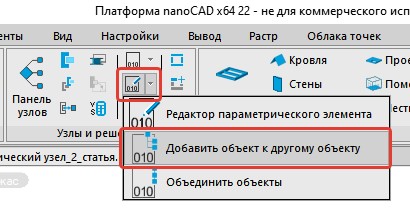 Сделать это можно классическим способом (создать элемент и поочередно добавлять нужные атрибуты), но я предлагаю сэкономить время и создать свойства через создание пластины и ее добавление к параметрическому объекту с помощью команды Добавить объект к другому объекту (рис. 13).