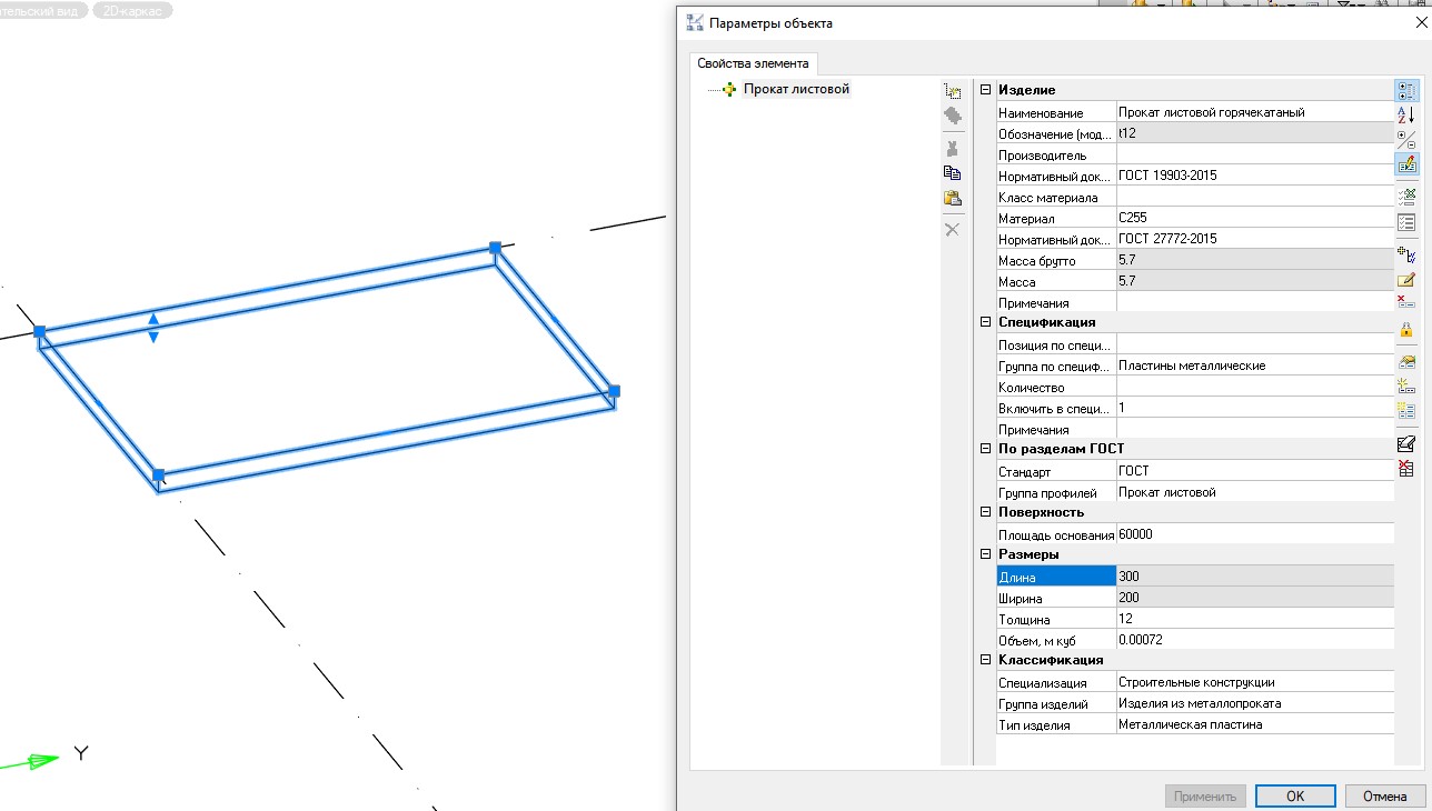 Создаем в пространстве модели пластину с прямоугольной геометрией. В свойствах объекта пластины уже имеется перечень необходимых атрибутов и параметров (рис. 14).