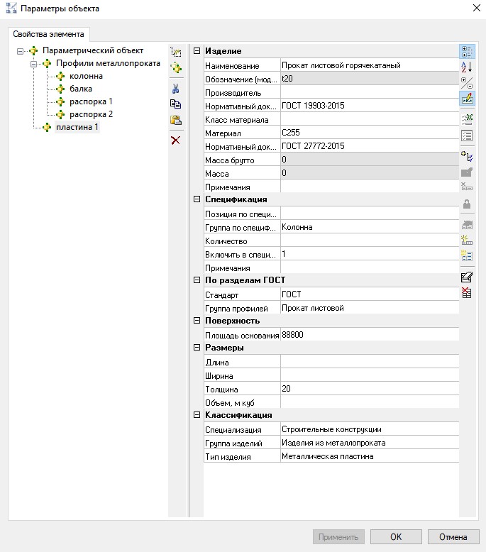 Анализируем геометрические размеры пластины: толщина 20 мм – это редактируемый параметр, длина равна высоте сечения профиля колонны, ширина равна ширине сечения профиля колонны.