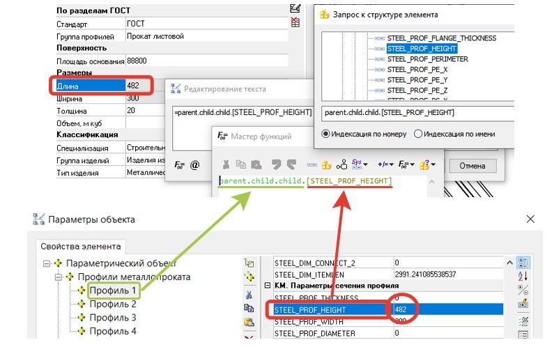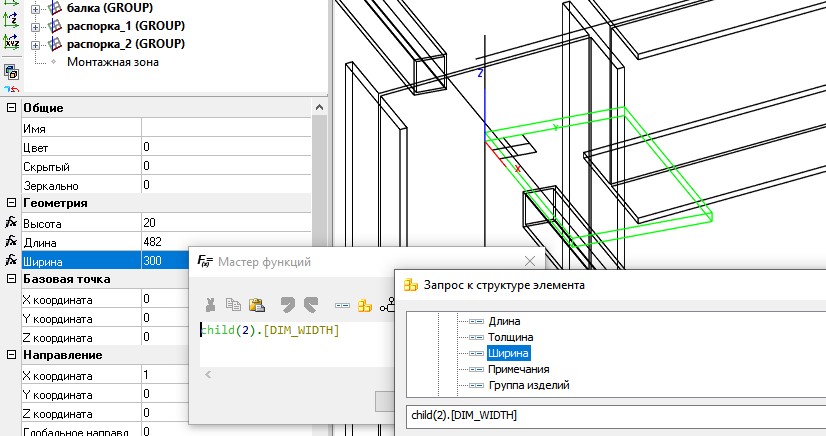 В окне Свойства параметра объекта связываем геометрические размеры созданного элемента и накладываем информационные зависимости его длины, ширины, высоты от геометрических системных параметров основных элементов.