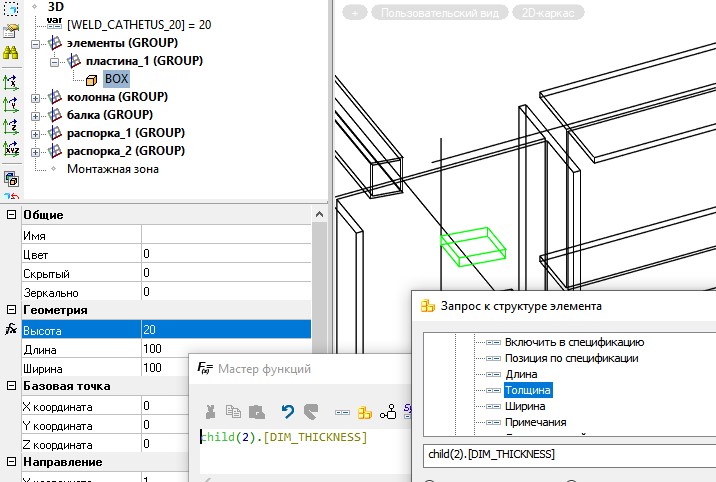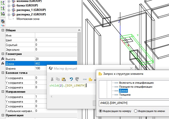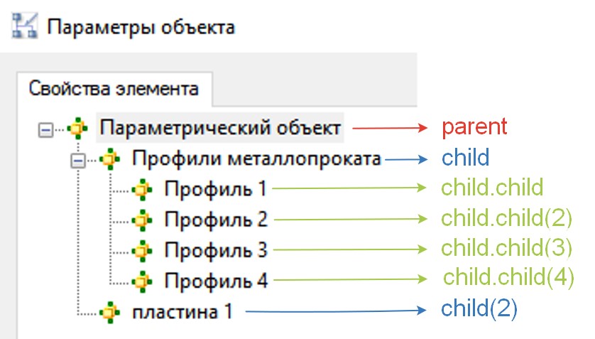 В окне Мастера функций появились новые обозначения: «parent» и «child». Они необходимы для того чтобы определить принадлежность информационного атрибута элементу иерархической структуры параметрического объекта. По структуре «parent» – это первый образующий, родительский элемент, а «child» – подчиненный элемент, который структурно входит в состав другого элемента. При наличии в одном элементе нескольких «child» к их обозначению добавляется порядковый номер в скобках (рис. 19) – поэтому в свойствах параметрического объекта очень важно сохранять структуру.