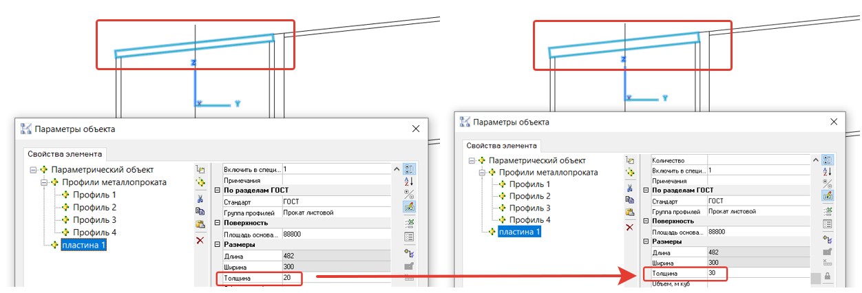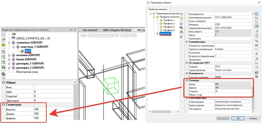 Рис. 17. Параметризация длины пластины в свойствах параметрического объекта