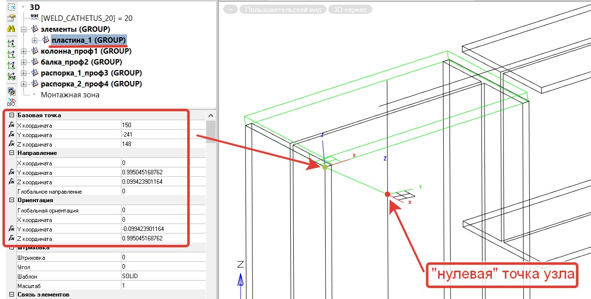 Таким образом мы определили базовую точку вставки торцевой пластины относительно «нулевой» точки узла. Далее определяем направление и ориентацию в пространстве.