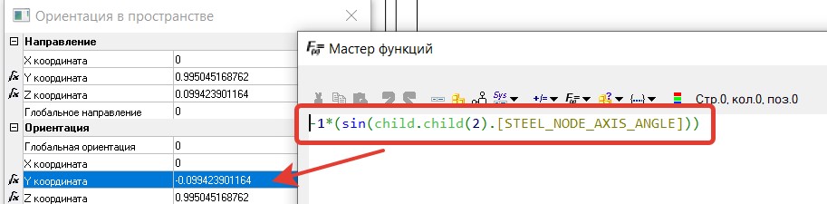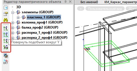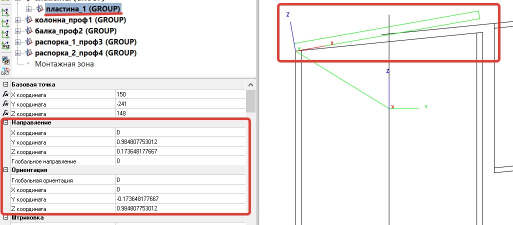 Пластина должна быть повернута на проектный угол. Направление и ориентация в пространстве задаются в Редакторе параметрического объекта в виде координат, которые сложно определить с первого взгляда. Напоминаю, что мы продолжаем редактировать группу «Пластина_1».