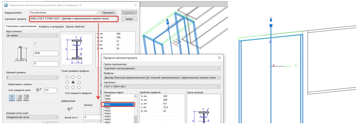 Изменение сечения колонны. Выбираем (выделяем) колонну и в диалоговом окне Создание металлической колонны изменяем ее сечение (рис. 37). Пластина изменила геометрические размеры и осталась в том же положении. Вывод: «работает».
