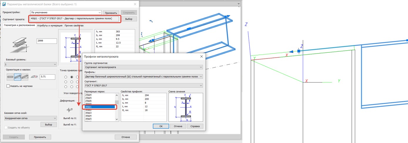 Изменение сечения балки. Выбираем (выделяем) балку и в диалоговом окне Создание металлической балки изменяем ее сечение (рис. 38). Пластина осталась на том же уровне, изменилось только положение «нулевой» точки узла. Вывод: «работает».