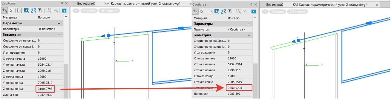 Изменение проектного угла. В свойствах балки увеличиваем значение атрибута «Z точка конца» на 150 мм (рис. 39). Угол поменялся, пластина и колонна изменили положение. Вывод: «работает».