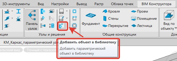 В nanoCAD BIM Конструкции командой Добавить объект в библиотеку (рис. 42) добавляем узел в библиотеку стандартных компонентов, выполняем действия из командной строки.