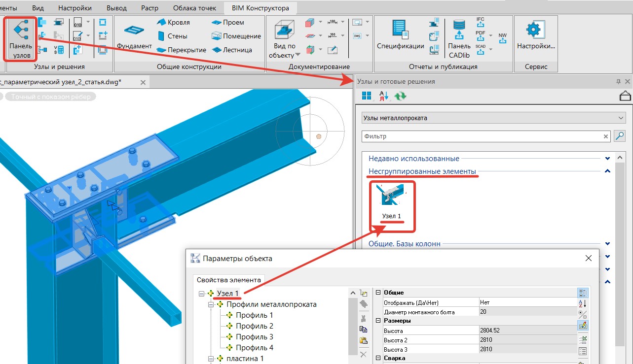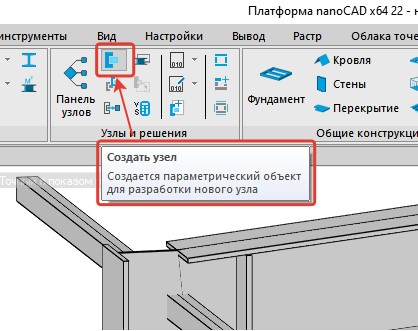 В nanoCAD BIM Конструкции командой Создать узел (рис. 5) создаем параметрический объект, выполняем следующие действия: