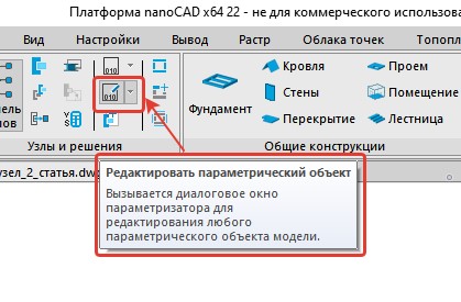 Дальнейшая работа будет выполняться в Редакторе параметрического объекта, который вызывается командой Редактировать параметрический объект (рис. 8). Для ознакомления с принципами работы в Редакторе рекомендую обратиться к пятому разделу тест-драйва nanoCAD BIM Конструкции.