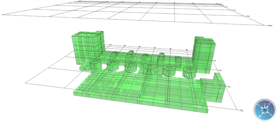 На момент начала работы с проектом единственной 3D-моделью сооружения была расчетная модель, выполненная в SCAD Office 21. Поэтому после позиционирования координатной сетки мы подгрузили эту модель в наш проект для проверки корректности расположения объектов в свободной модели – и сразу же получили первую трехмерную компоновку модели. Результат впечатлил: модель не просто «легла» точно в координатную сетку, она тут же задала объемность и ощущение цельного сооружения (рис. 5).