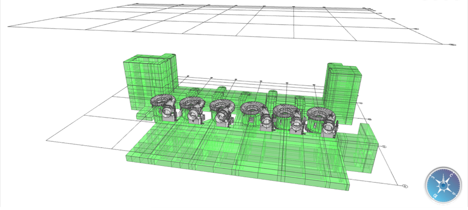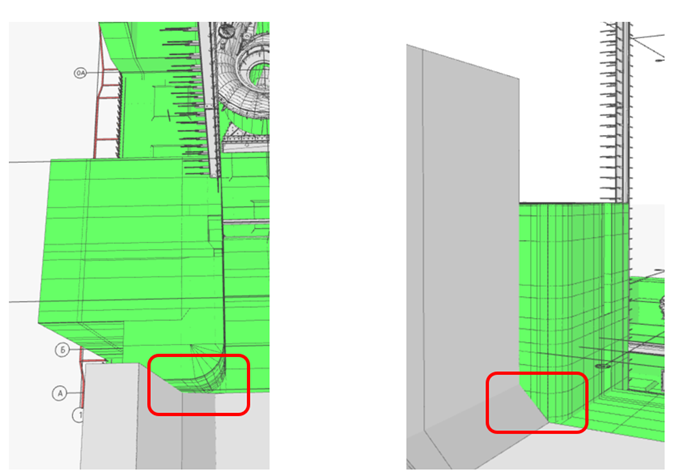 Какие преимущества мы уже сейчас получили от проделанной работы? На очередном этапе проработки (рис. 8), собрав модели от семи конструкторов по одной координатной сетке, опытный конструктор увидел зону потенциальной проблемы (рис. 9): некорректное сочленение геометрии аванкамеры и расчетной модели (а значит в перспективе и ярусов бетонирования). Следствием этого оказались бы проблемы в режиме работы станции из-за нарушения характеристик потока воды.