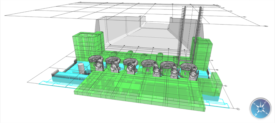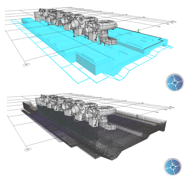 При реализации сложных и масштабных проектов всегда встает вопрос о размерностях – даже на уровне комплекса зданий, не говоря уже о масштабах гидроэлектростанций (рис. 3). Ведь проектируемое здание ГАЭС – это значительный объем монолитных и сборных железобетонных конструкций, представляющих собой единый комплекс, и его невозможно реализовать в рамках одного файла *.dwg, равно как и файла любого другого формата. Здесь огромным преимуществом становится прямая взаимосвязь nanoCAD BIM Конструкции с программным продуктом CADLib Модель и Архив, который позволяет получить сводную модель любых размеров, а также реализовать не только совместную работу нескольких конструкторов в рамках одного раздела, но и подключение смежников, чтобы избежать ошибок и коллизий.