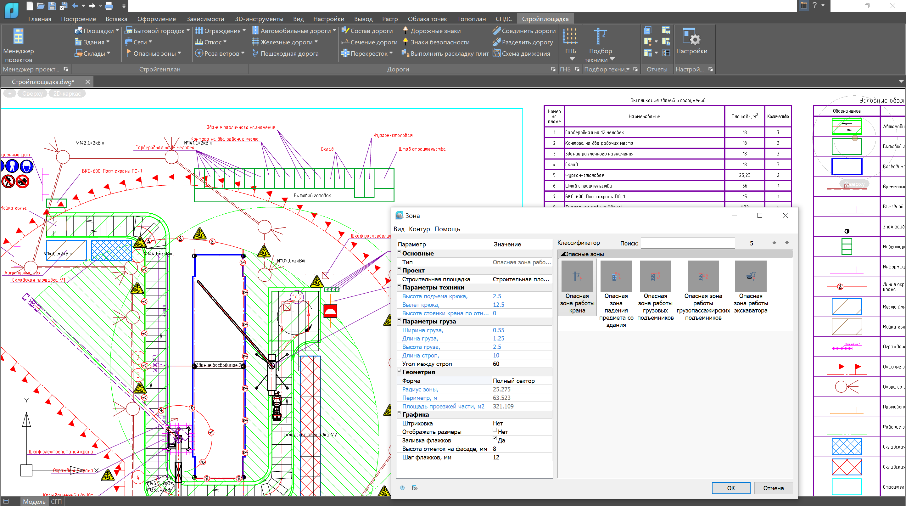 Следующий этап подготовки строительного проекта – разработка его генерального плана. Для этого в приложении также имеется специальный инструментарий. Он сгенерирует экспликации зданий, рассчитает и обозначит на плане опасные зоны строительства, рабочие зоны для подъема грузов, учитывая при этом возможности и характеристики техники, которую планируется использовать.