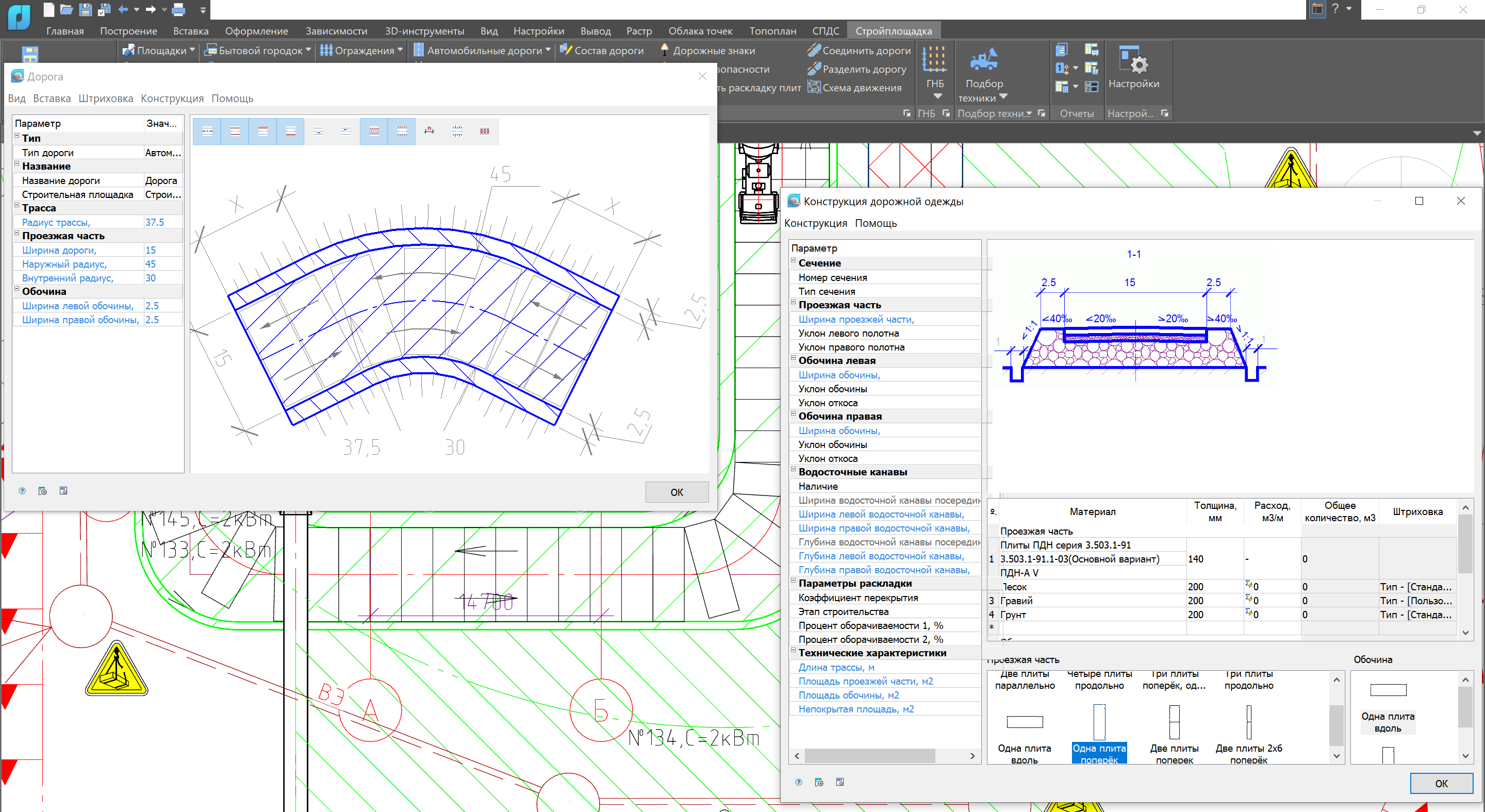 Помимо самого генплана в nanoCAD Стройплощадка можно спроектировать прокладку временных дорог и подъездных путей. Даже отрисовать откосы, если этого требует рельеф строительной площадки.