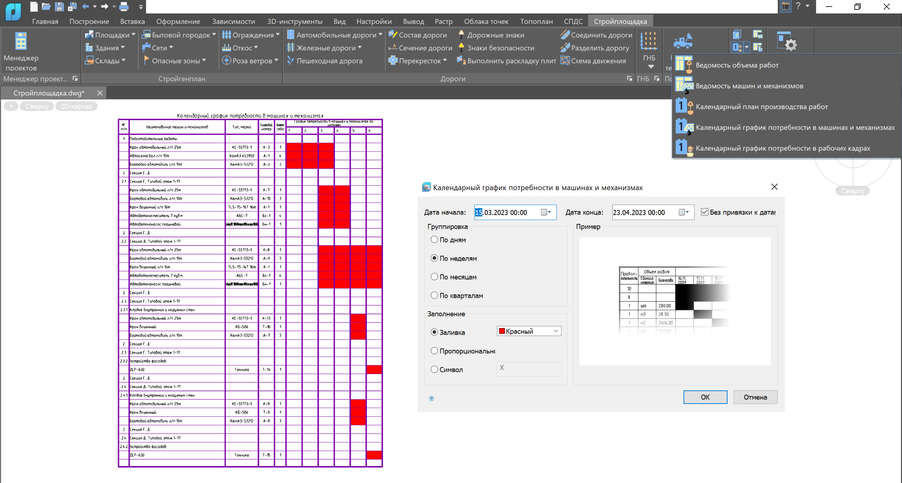 Наконец, на основе всех введенных данных nanoCAD Стройплощадка автоматически генерирует отчеты: ведомость объектов работ, календарный план, графики потребности в технике и ресурсах, график движения рабочей силы.