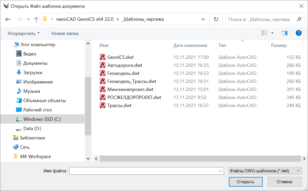 Не каждый пользователь задумывается о том, что чертеж создается на основе шаблона в формате DWT, а ведь от этого зависит оформление документации проекта. При создании чертежа в nanoCAD GeoniCS можно выбрать как стандартный шаблон, который входит в состав дистрибутива (рис. 1), так и пользовательский.