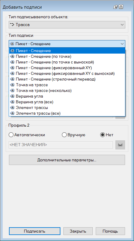 Создание подписей вручную в указанных пользователем точках трассы производится при помощи команды Подписать трассу (рис. 10). В отличие от подписей, сформированных генератором, здесь при изменении трассы – например, при добавлении новых вершин – новые подписи не появляются автоматически. Зато подписи, созданные вручную, можно оттягивать – в отличие от сгенерированных.
